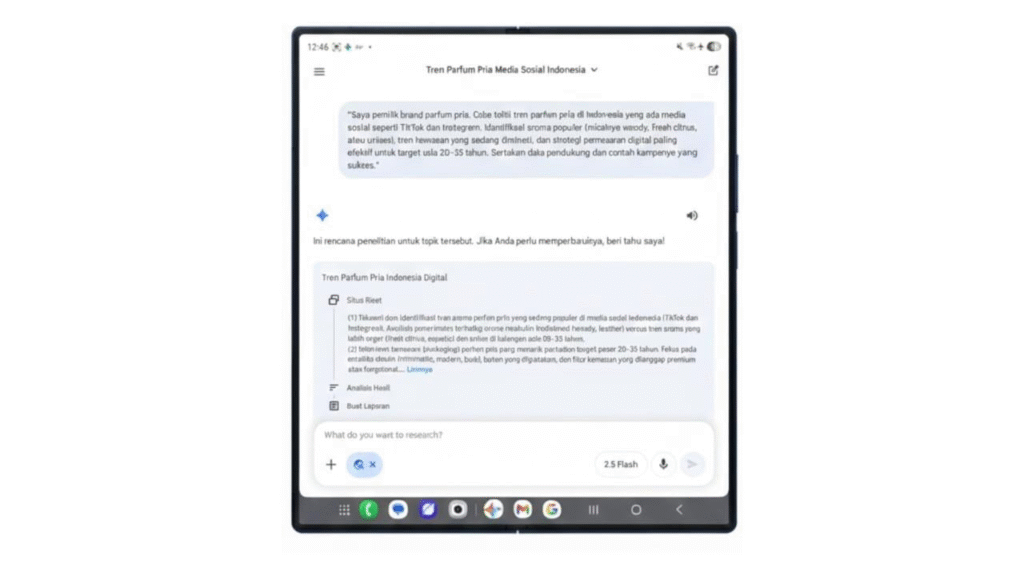 Sebagai contoh, pemilik brand parfum pria cukup memasukkan prompt terkait tren aroma, kemasan, dan strategi pemasaran digital untuk target usia 20–35 tahun. Dalam waktu singkat, Galaxy Z Fold7 menyajikan gambaran lengkap seperti meningkatnya minat pada aroma woody premium, tren kemasan minimalis elegan, serta efektivitas konten video pendek untuk promosi TikTok. Informasi ini bisa langsung digunakan untuk menyusun brief produk maupun rencana kampanye pemasaran.