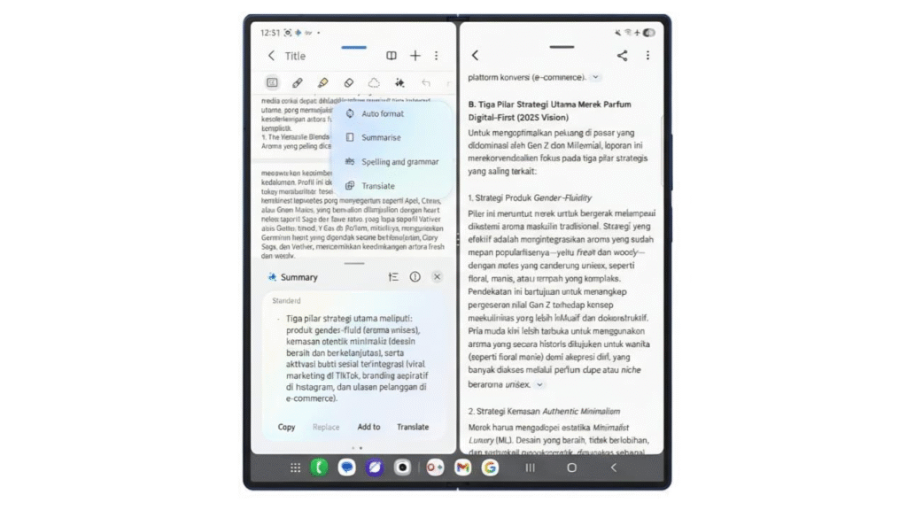 Keunggulan Galaxy Z Fold7 makin terasa karena seluruh hasil riset dari Gemini Deep Research dapat langsung diproses di perangkat yang sama melalui Samsung Notes. Di tahap ini, Note Assist—bagian dari Galaxy AI—mengambil alih untuk merapikan, merangkum, hingga menerjemahkan materi.